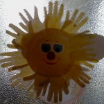 Na prvním je sluníčko, syn Adam (4 roky) otiskal ručičky nabarvené vodovkami na papír, po uschnutí jsme je vystřihali, já maminka vystřihla středové kolečko sluníčka a pak jsme k němu nalepily vystřihané ručičky a hotovo.