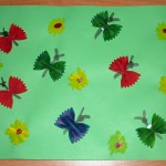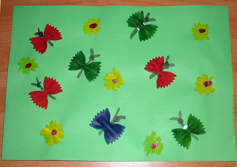 Dnes mě při nakupováni napadlo jak využít s dětmi těstovinky, budete potřebovat mašličky, hned jsme se do toho pustili… vezmete, zelenou čtvrtku, nemáte-li namalujete čtvrtku na zelenou jako louku můžete domalovat kytičky, černou tuší uděláte čárky jako tělíčka motýlků i s tykadly, mezi tím než to zaschne si těstoviny namalujete na různé barvičky, po zaschnutí mašliček, je herkulesem přiděláme na papír a máme louku plnou motýlků.