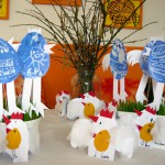 Takhle jsme si vyzdobili s dětmi naši školku. Kohoutci jsou udělaní technikou malování zmizíkem na tvrdý papír natřený inkoustem. Slepičky mají křídla polepená vatou a kuřátka na bříšku nalepená z vlnkového papíru, dětmi dozdobeno a domalováno tuží. To vše je naaranžováno s květináčky naklíčeného obilí. Děti MŠ Padochov. (Ivana K.)