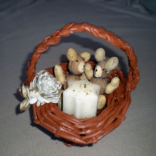 Košíček i s ouškem měří cca 20 cm. Je vyrobený z papírových ruliček a natřený hnědým balakrylem. Medvídci i svíčka jsou součástí košíčku. Lze se domluvit i na jiné velikosti, či na zcela jiném košíčku 🙂