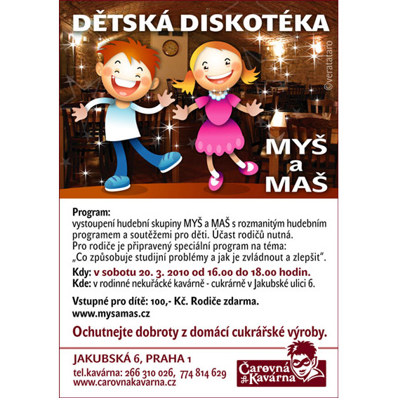 - Jarní diskotéka v centru Prahy. (viz pozvánka v příloze). Zveme všechny děti do 10ti let s rodiči na jedinečnou českou dětskou diskotéku do Čarovné kavárny v Jakubské ulici č. 6, praha 1 (mezi Ungeltem a OD Kotva) v sobotu 20.3. od 16. do 18. hodiny. Je pro Vás připraven bohatý hudební program, soutěže a zábava od hudební skupiny Myš a Maš. Pro rodiče je nachystán doprovodný program …
