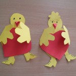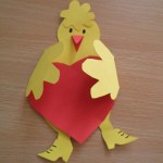 Předškoláci vystřihovaly kuřátko a dokreslily. Vystřihly srdíčko a vložily kuřátku mezi křidýlka. Pomůcky: červený a žlutý papír, nůžky. (Bc. Hana Š.)