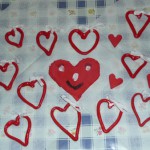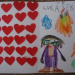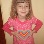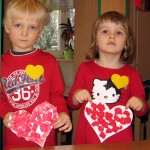 Celé tvořila má dcera Pavlína (5 let) – vystřihla si z tvrdého barevného papíru dva stejné obrysy srdíčka na jeden přilepila listy a druhé srdce přilepila na to první. Po té si vystřihala kytičky a ozdobila si tím srdíčko. Srdce je zavěšené na vlasci a je oboustranné a točí se nám na lustru. (Hana P.)