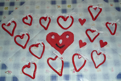 Honzík natřel polystyrénové mašličky červeně a nalepil je na srdíčko. Kačenka stočila červené proužky krepáku a vyzdobila srdíčko. (Honzík Z., Kačka M.)