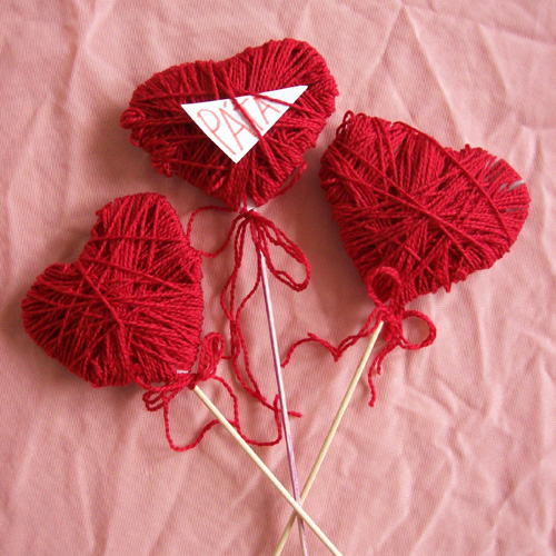 Postup: Na obyčejnou špejli připevníme srdce z tvrdého kartonu. Ne příliš velkou,aby se později neodlomilo. Po-té srdce začneme omotávat červenou vlnou až získáme nadýchaný vzhled.