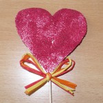 Pomůcky: dekorační písek červené barvy, štětec plochý, tvrdý papír bílý, špejle, tužka, tevná pistole, nůžky, lepidlo Herkules, barevná lýka, nádoba na písek.