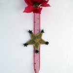 Postup: pomocí šablony vystříhneme dvě hvězdičky, jednu menší a druhou o trochu větší. Doprostřed kápneme lepidlo, přiložíme stužku a pak druhou hvězdičku. Aby se hvězdičky pořádně spojili, sepneme je kolíčkem na prádlo.