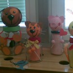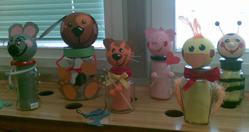 Pomůcky: sklenice, barevné papíry, temperové barvy a hobby barvy, špejle, mašle, tavná pistol, nůžky, polystyrénová koule, mechový drátek, drátek, peříčka, malé papírové kuličky na konce tykadel, transparentní papír na křidýlka.
