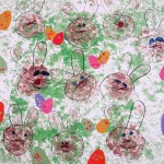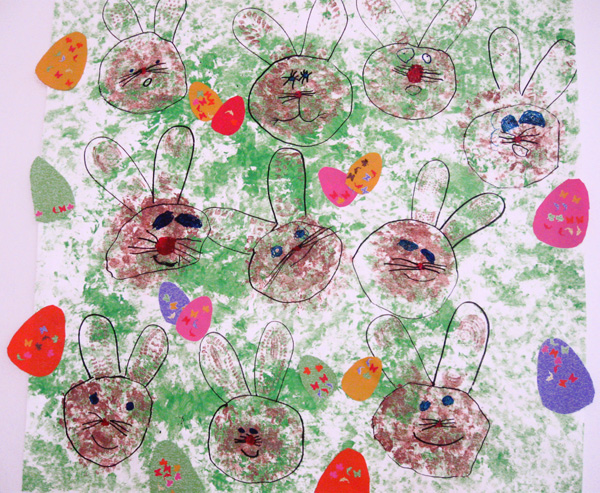 Na velký balící papír jsme natupovali zelenou temperu. První jsme otiskli své boty jako zaječí uši, pod které jsme natupovali i zaječí hlavu. Zajíčka jsme domalovali tuší. Vajíčka jsme vystřihli z barevných papírů a z vytlačovaček jsme vytlačili ozdoby, které jsme na ně nalepili. Barevná vajíčka jsme polepili kolem zajíčků. Malba zajíčků byla motivována …