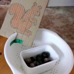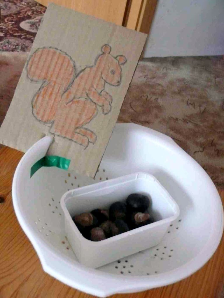 Obrázek izolepou připevněte na velkou mísu, do misky dejte oříšky. Dítě z přiměřené vzdálenosti hází oříšky veverce. Malé děti pravděpodobně zabaví i pouhé přendávání oříšků z misky do misky. Nejprve dítěti vyprávějte o veverkách, které si na zimu dělají zásoby oříšků, aby měli co jíst. Pak mu navrhněte, že jedné takové veverce pomůžete.