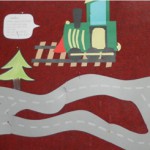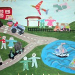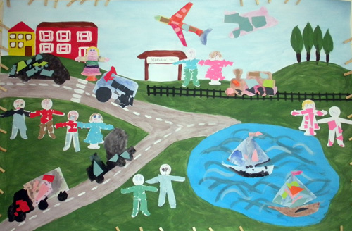 Městečko namalováno staršími dětmi temperovými barvami, postavičky dětí a dopravních prostředků vyrobeny volnou technikou dle výběru dětí (vybarvování, dolepovaní barevnými papíry, omotávání vlnou). Děti MŠ Padochov, třída Růžová