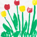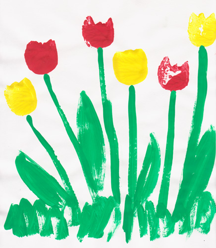 Popis: Bramboru přepůlíme a nožem vykrojíme tvar tulipánu. Do kelímku vymáčkneme temperovou barvu (červenou nebo žlutou), namočíme do ní bramboru a otiskneme na papír. Štětcem domalujeme stonky a listy.