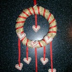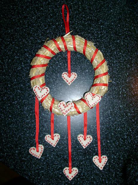 Základ tvoří slaměný věneček, který se zakoupí například v květinářství. Ozdoby, tedy srdíčka jsou vyrobeny ze slaného těsta. Těsto se vyválí a vykrajujeme srdíčka do kterých děláme špejlí dírky. Pečeme v troubě. Po vychladnutí srdíčka zdobíme červenou barvičkou na sklo. Věneček omotáme červenou tenkou stužkou. Tavnou pistolkou lepíme srdíčka na věneček a další vázeme na stužku a druhý konec lepíme pistolkou na rubovou stranu věnečku. Vyrobil Honzík 9 let. (Blanka L.)