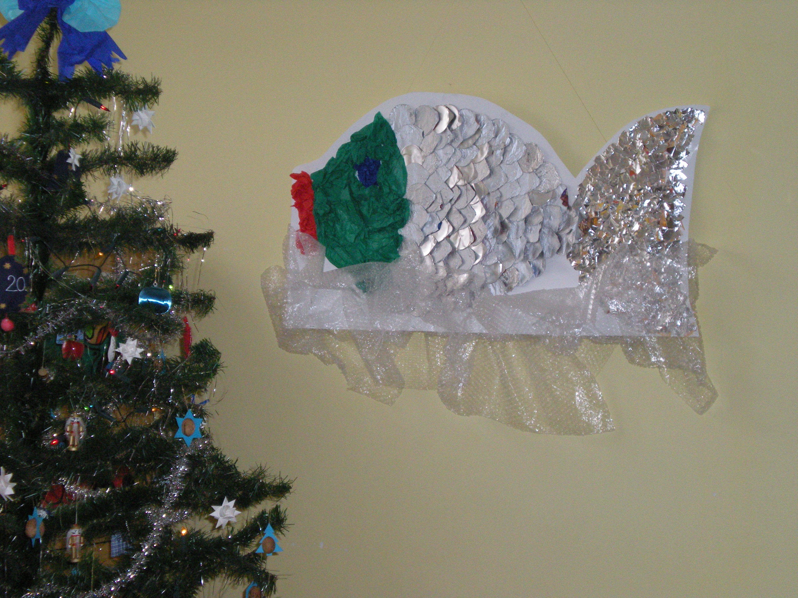 Vánoční kapříkKapr má velikost cca 1,5 m. Je vyrobený z velkého kartonu, na který jsme společně s dětmi nalepili víčka od jogurtů, která jsme sbírali od září 🙂