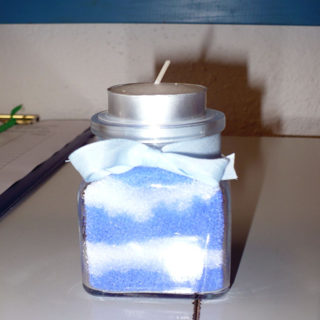 Připravíme si kořenku, ze které odejmeme skleněný vršek, ten používat nebudeme. Dále si nasypeme do misky polovinu soli ze sáčku a tu obarvíme nepatrným zakápnutím modrého inkoustu. Záleží na nás, jakou intenzitu modré zvolíme. Důkladně promícháme vařečkou, aby se barva pěkně chytla. Tuto nabarvenou sůl necháme, za občasného promíchání, nejlépe do příštího dne v pokojové teplotě vyschnout. Ač se to nezdá, sůl se krásně obarví, ale pro výrobu svícínku by měla být suchá. Až nám sůl vyschne, tvoříme střídáním bílé a obarvené soli vrstvy. Každé patro čajovou lžičkou poctivě utlačíme, aby se nám vrstvy nesmíchaly při případném přemístění svícínku. Až kořenku zaplníme, zbývá už jen přivázat mašličku kolem hrdla kořenky a do hrdla umístit čajovou svíčku. Aby čajová svíčka nestála na soli, umístíme pod ní plastový uzávěr, který neprodyšně spojoval horní a spodní část kořenky. Tím si zajistíme, že se nám sůl nevysype při možném přenášení svícínku. Podle popisu by se mohlo zrát, že výrobek je náročný, ale opak je pravdou. Nejen dětem, ale i dospělým udělá radost.