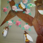 - Strom – kokosová kůra je nalepena do tvaru stromu – Na ten lepíme jednotlivé detaily (včelky, květy, jablíčka, lístečky, sněhové vločky, ptáčky – záleží na fantazii). Strom je nalepený na velkém archu vlnkového papíru, (strom můžeme připevnit rovnou na stěnu).