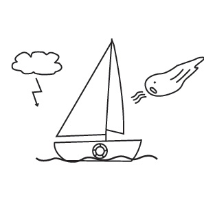 (kresba stožáru, plachty, obtáhnutí plachty, kresba vlnek okolo loďky)