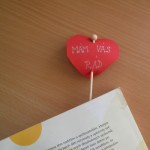 Zapichovátka do květináče nebo záložka do knížky, které vystřihovaly malé děti 3-4 roky. Učitelka dopíše a propíchne špejlí, na kterou nalepila dřevěnou korálku.
