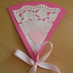 Děti vystřihnou růžový trojůhelník, na který přilepí výseč z dotrového ubrousku. vystřihnou srdíčko růžové byrvy, ale jiného odstínu a nalepí na papírovou krajku. zezadu přilepí učitelka špejli a po zaschnutí přivážou mašličku. Pomůcky: papírová krajka – ubrousek pod dort, barevný papír, stužky nůžky, ozdobné nůžky, lepidlo (Bc. Hana Š.)