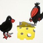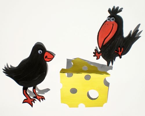 Sýr (tvrdý papír natřený žlutou temperou, díry vystřihla maminka), vrány (vymalovány šablonky a dolepeny očička). Vytvořila Ája (5 let) za pomocí maminky (2v1).
