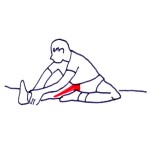 • Chodidlo levé nohy se dotýká vnitřní strany stehna natažené pravé nohy, pomalu se předkláníme až k pocitu protažení, chodidlo natažené nohy vzpřímené.